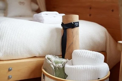 A collection of cabins is nestled within the forest, designed for privacy and connection to the land. Interiors feature organic materials, plant-based mattresses, flax linens, and curated wellness elements.